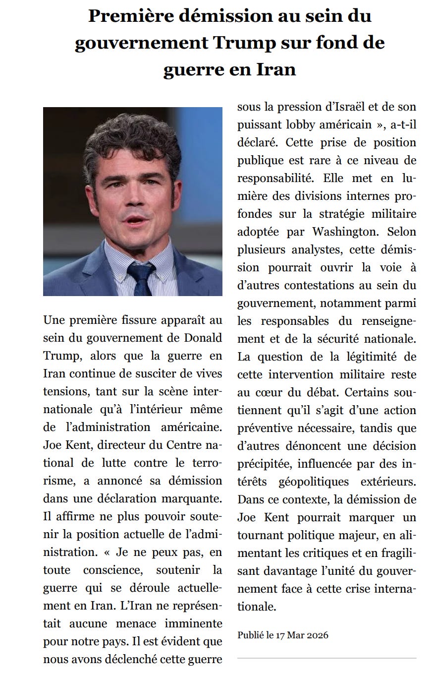 ArticlesPremière démission au sein du gouvernement Trump sur fond de guerre en IranDieunoldmars 17, 2026Partager