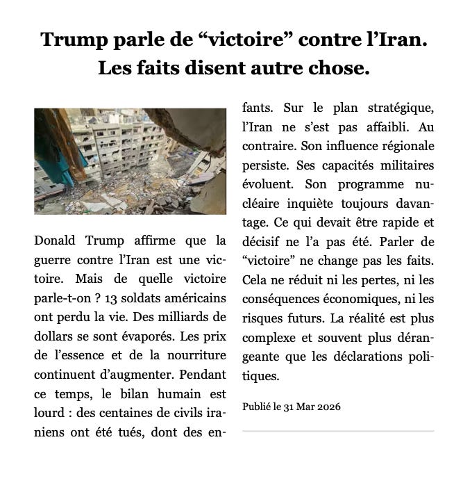 ArticlesTrump parle de “victoire” contre l’Iran. Les faits disent autre chose.Dieunoldmars 31, 2026Partager